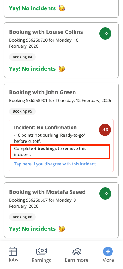 The Worker App will tell you how many clean bookings you need to remove an incident.